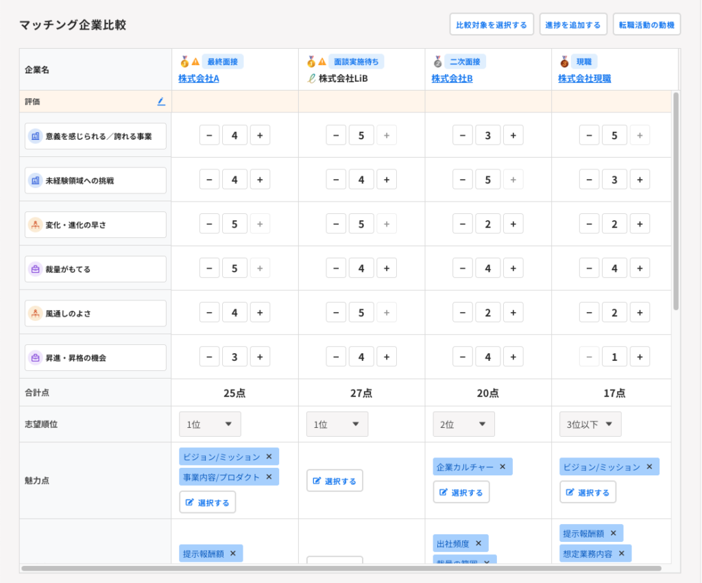 具体的な話で行くと、直近リリースしたものに企業比較機能というものがあります。個人と向き合うエージェントが共に転職軸を整理するために、スプレッドシートで運用していた整理シートがありました。個人の転職軸を整理する上で重要な役割を果たしていたこのシートを、PFWの構造化されたデータと接続し、個人の認識と行動のアップデートができる仕組みにすべく、プロダクトの機能として実装することになりました。プロダクト上での見せ方やデータの埋め方など、エンジニアと試行錯誤しましたが、一から作った経験がとてもよい学びになりました。まだまだ改善中のこの機能ですが、これも1か月で実装しましたね。
